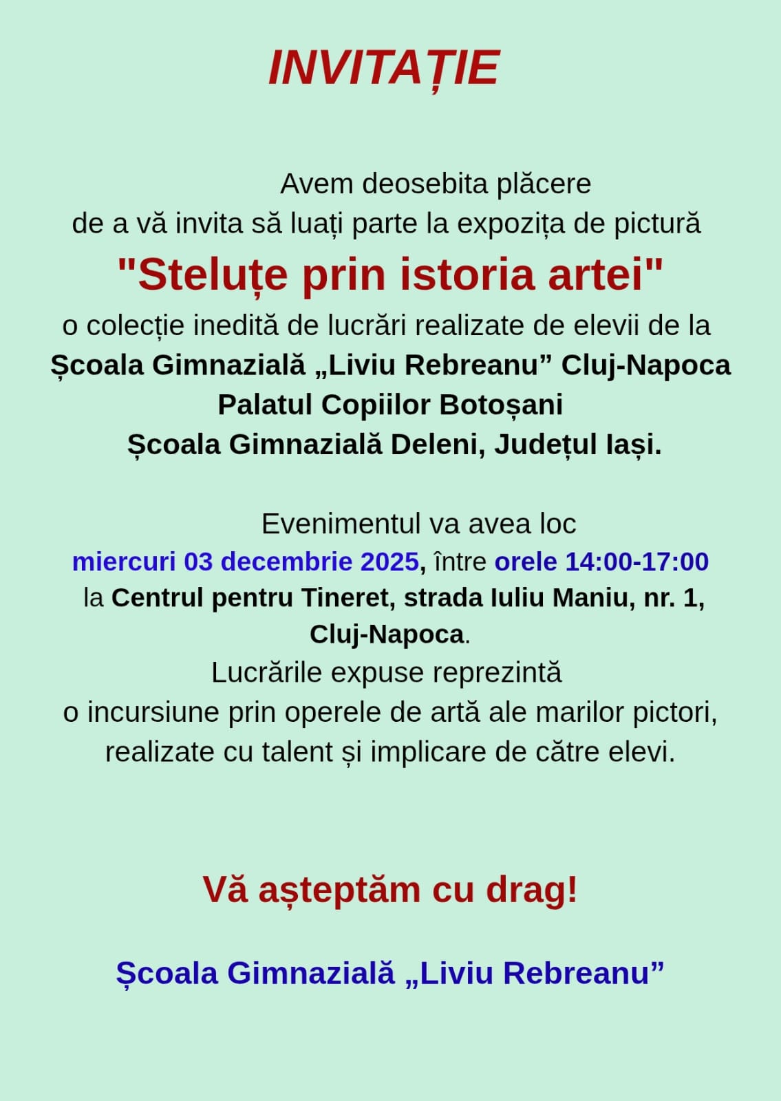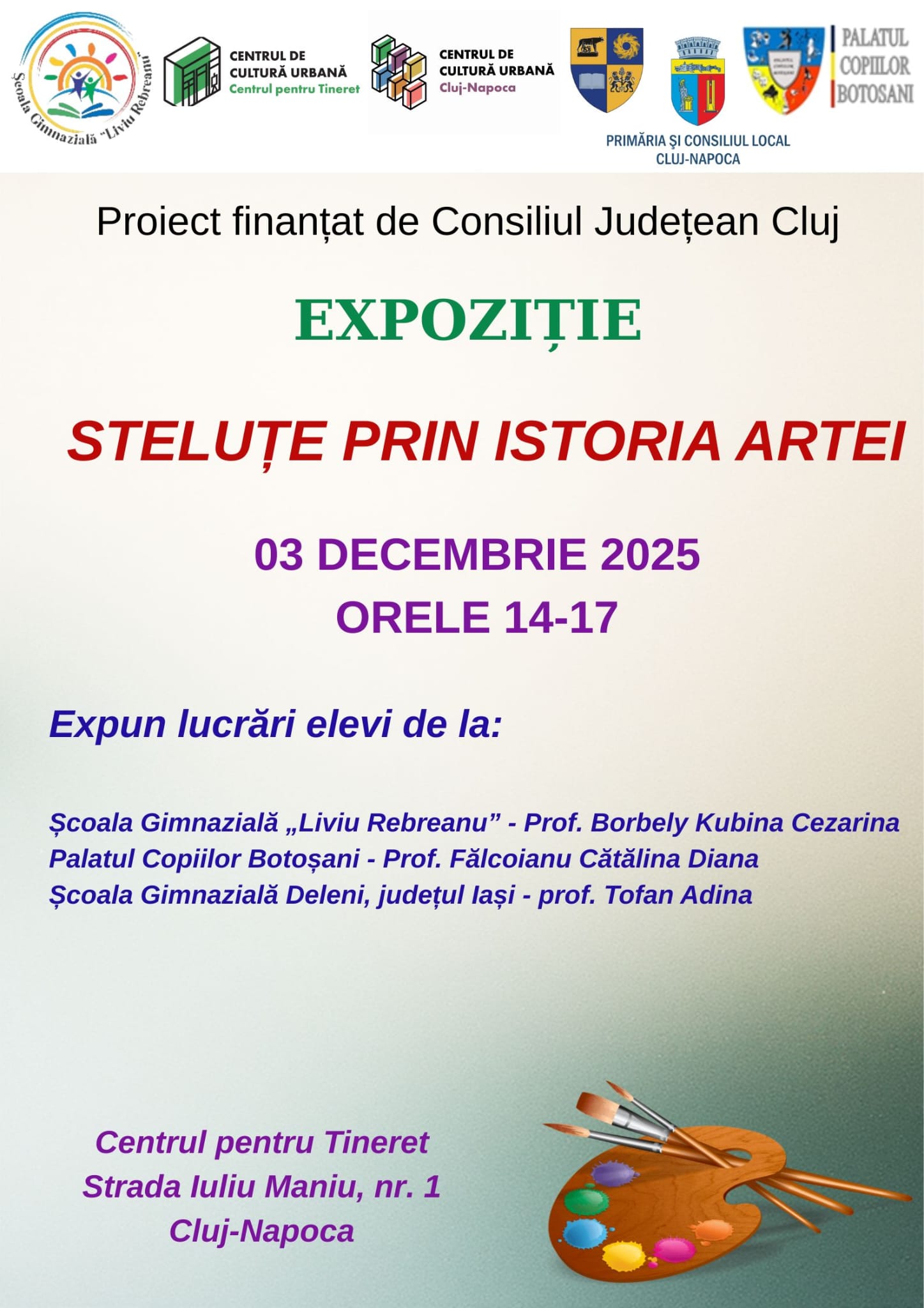 Proiectul “Steluțe prin istoria artei”2025Proiectul “Steluțe prin istoria artei”Expoziție “Steluțe prin istoria artei” – afișInvitație “Steluțe prin istoria artei”